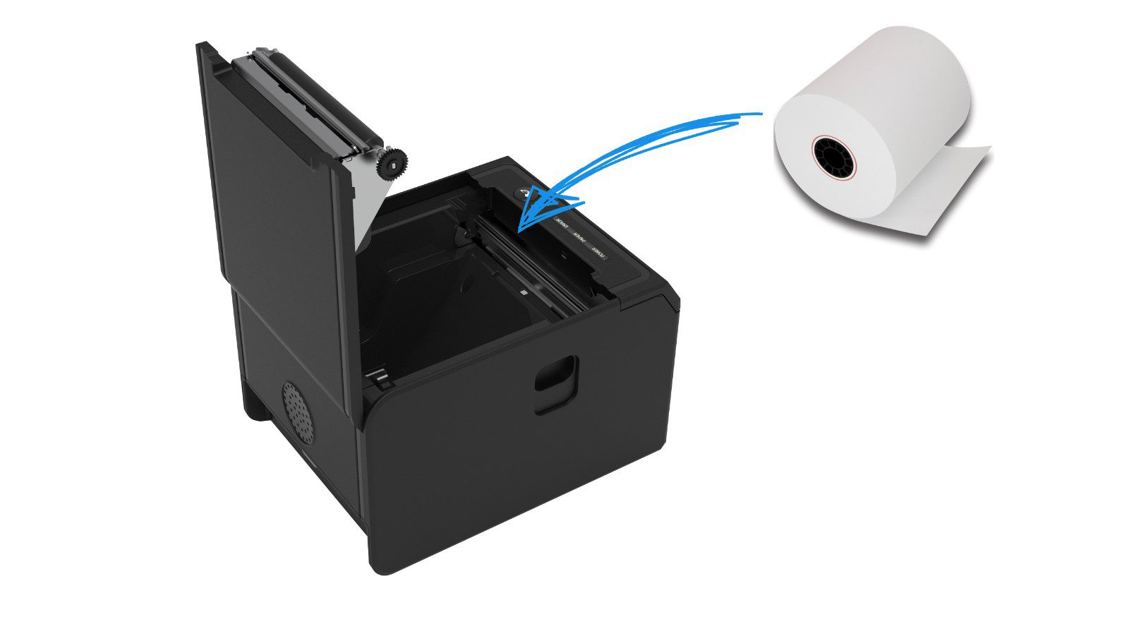 قبل از نصب رول برای ایمنی بیشتر پرینتر را خاموش کنید و با دکمه باز کردن درپوش آن را باز کنید و رول را در محفظه قرار دهید و مطمئن شوید که کاملا به درستی جا افتاده است. سپس درپوش را ببندید تا قفل شود و از فشار بیش از حد هم به درپوش خودداری کنید.